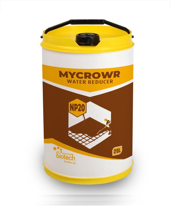 MYCROWR NP20 is a Melamine Formaldehyde Sulfonates (MFS) / Naphthalene Sulfonate Condensates (NSC) based water reducer admixture and supplied as a brown liquid instantly dispersible in water. This generally improves cement dispersion. At the start of the mixing process an electrostatic dispersion occurs due to which cement particle's capacity to separate and disperse increases. This mechanism considerably reduces the water demand in flow able concrete.