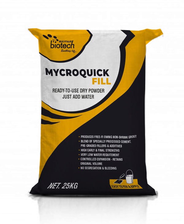 MYCROQUICK FILL is supplied as a ready-to-use dry powder, requiring only the addition of water to produce a free-flowing non-shrink grout. The material is a blend of specially processed cement, pre graded fillers and additives which impart high early and final strengths due to very low water requirement Controlled expansion to retain the original volume filled even after setting free flow characteristics without any segregation and bleeding.