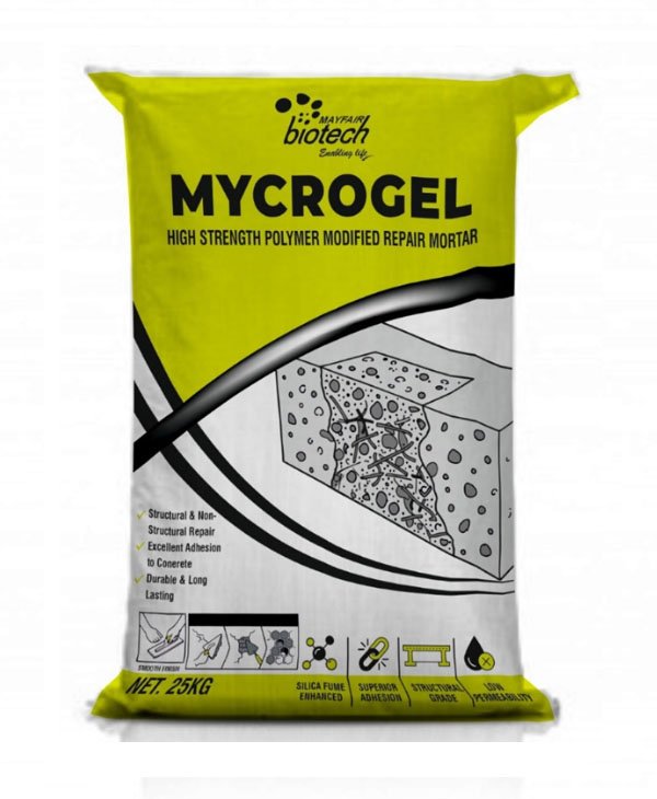 MYCROGEL is a high-performance polymer-modified cementitious repair mortar designed for structural and non-structural repair of damaged concrete. The formulation combines high-grade cement, graded quartz aggregates, silica fume, polymer modifiers, and special additives to produce a dense, high-strength repair mortar with excellent adhesion to concrete substrates. MYCROGEL is specially engineered for repairing spalled concrete, honeycombs, cracks, and deteriorated structural members. The advanced polymer technology improves bond strength, flexibility, and durability, while silica fume enhances compressive strength and impermeability. The product is ideal for infrastructure, industrial, and civil construction repairs where durable and long-lasting concrete restoration is required.